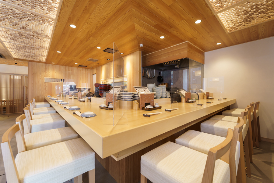 板前の仕事ぶりを楽しめるカウンターはお寿司屋さんの醍醐味。寿司を握る、てんぷらを揚げる。一つ一つの仕事ぶりを目で楽しめます。席ごとにアクリル板を設置し感染症対策も万全です。