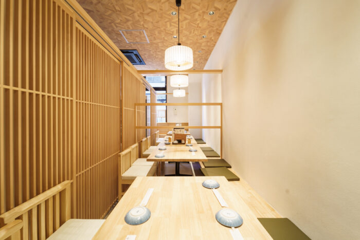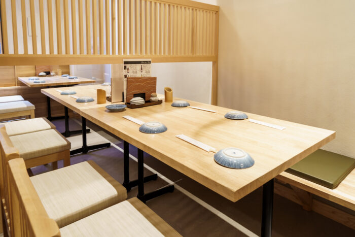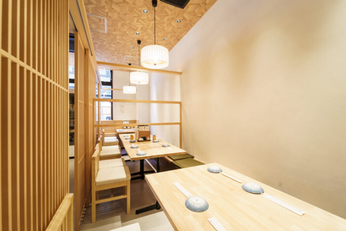 店舗の一番奥にあるスペースは、6名様までご利用可能な個室席。お祝いの席や、接待など人目を気にせずご利用頂けます。テーブル席との間仕切りを取り払って、宴会スペースとしてご利用頂くことも可能です。