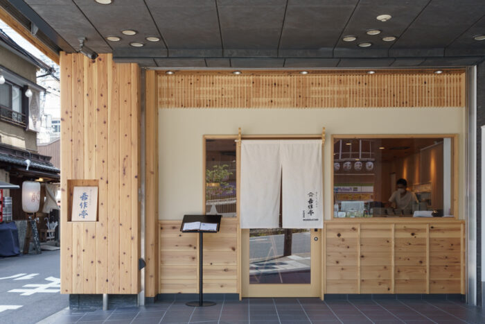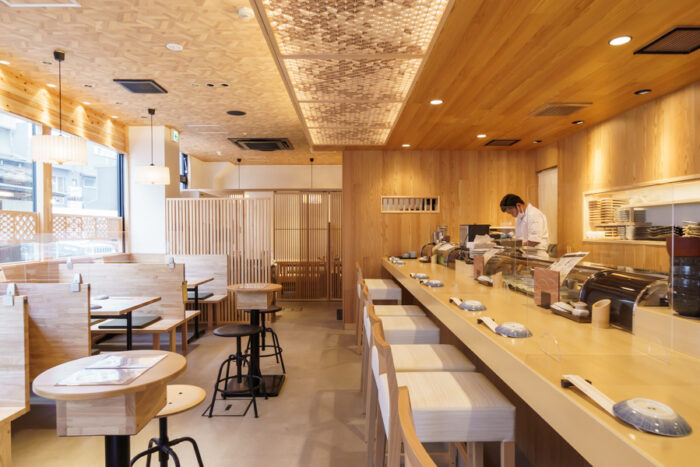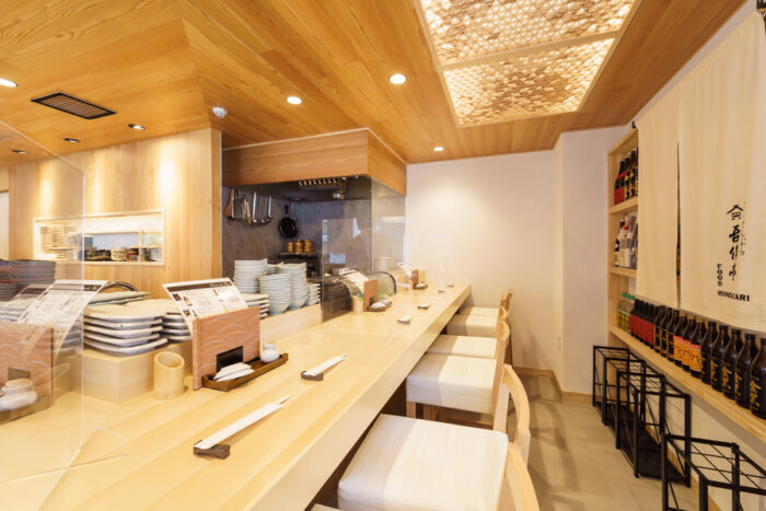 木目の表情にこだわった白木が特徴的な外観は、道路の向かい側からも存在感を示すほど特徴的。また、天井や壁面に伝統工芸の組子細工を施した内装は、見た目でもお客様を楽しませてくれます。板前さんの仕事ぶりを見ながらお食事を楽しめるカウンター席や、カジュアルにお寿司を楽しめるテーブル席など、その日の用途に応じて使い分けられるよう様々なお席を用意しています。