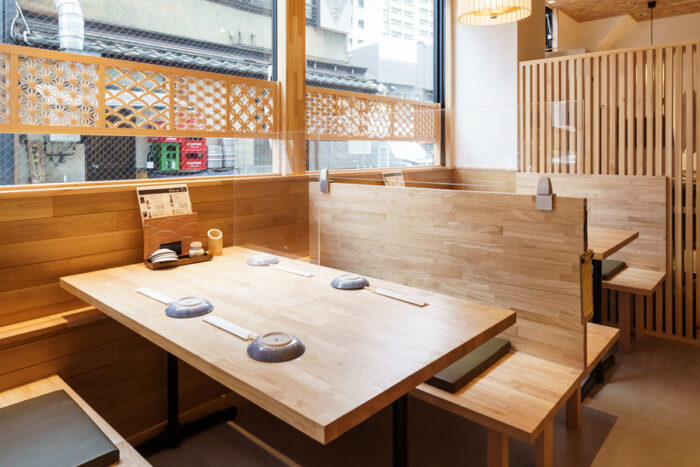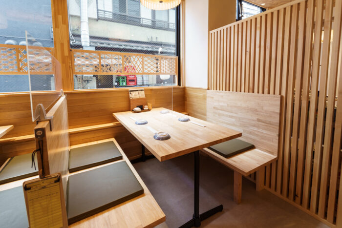 ガラス面に組子細工をパッチワーク上に配したテーブル席。本格的なよそ装いのカウンター席とは違って、カジュアルにお寿司を楽しめるお席です。初めてお寿司店を利用するという方にも入っていただきやすいお席です