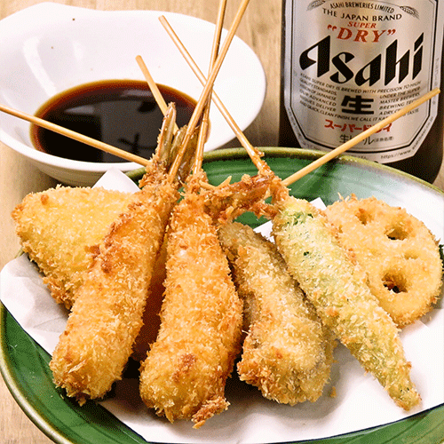 鮮度抜群の海鮮はもちろん、国産にこだわった旬の野菜など。素材を厳選した串カツをリーズナブルにご提供。単品での注文ができるので、お刺身と一緒にご注文されるお客様も多くいらっしゃるお魚食堂の人気メニューです。