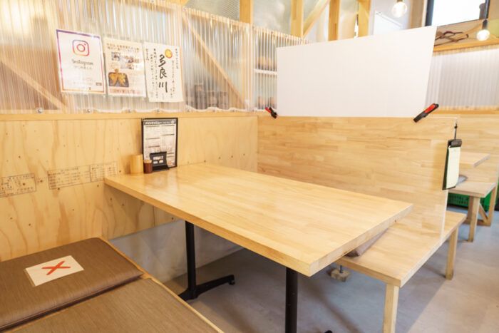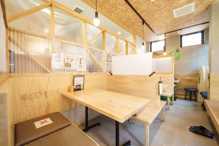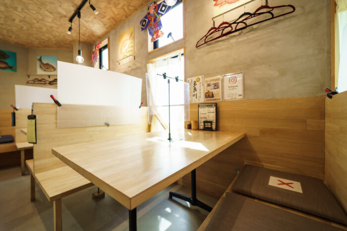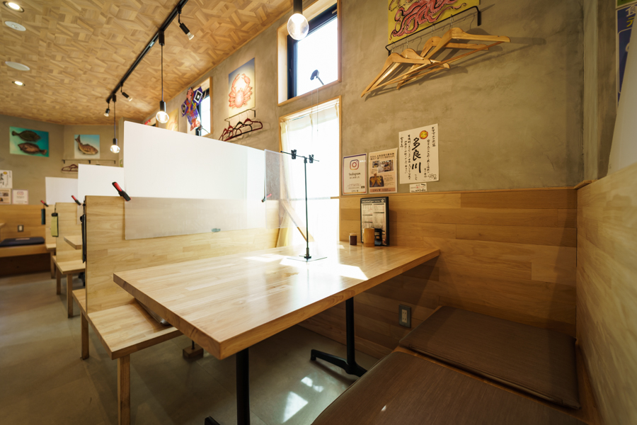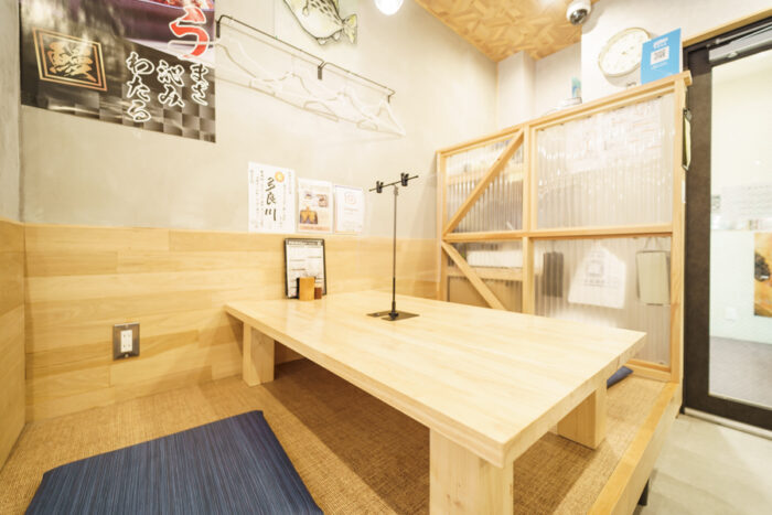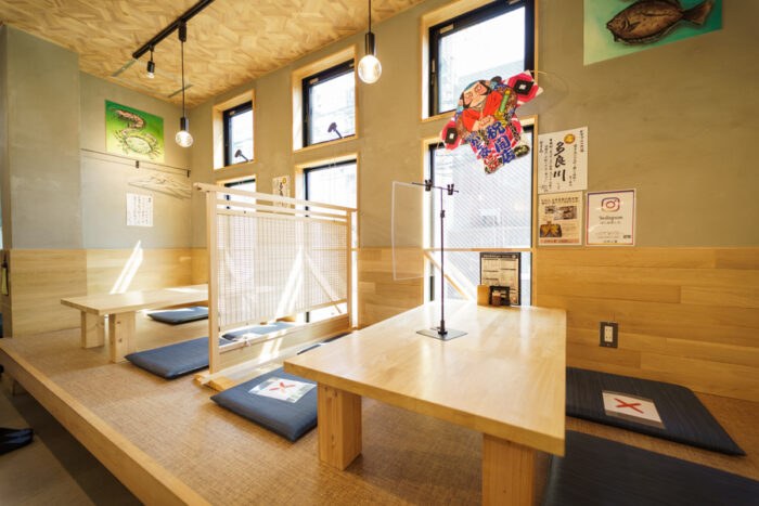 全24席のテーブル席。広々としたBOXテーブル席は、仕切り付きで周りを気にせずお楽しみいただけます。宴会の際は靴を履いたまま座れるのが嬉しい、使い勝手の良いお席です。