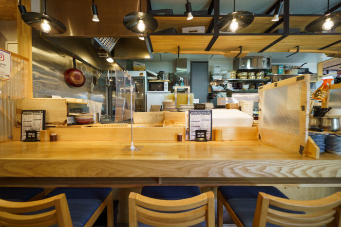 卓上には飛沫感染防止板を設置◎目の前にはとれたてのネタがたくさん入ったショーケースが並びます。職人が寿司を握る光景に、思わず見入ってしまう特等席。お一人様も大歓迎です!「お仕事帰りにちょっと一杯!」とお気軽に立ち寄ってください。