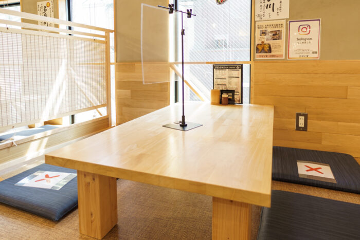 靴を脱いでのんびりくつろげる、宴会にぴったりのお座敷です。小さいお子様がいるご家族でもゆっくりお食事できます。全3卓で12名様までご利用可能。大人数でにぎやかな雰囲気に※現在、行政からの要請に伴い4名様以下でのご利用をお願いいたします。