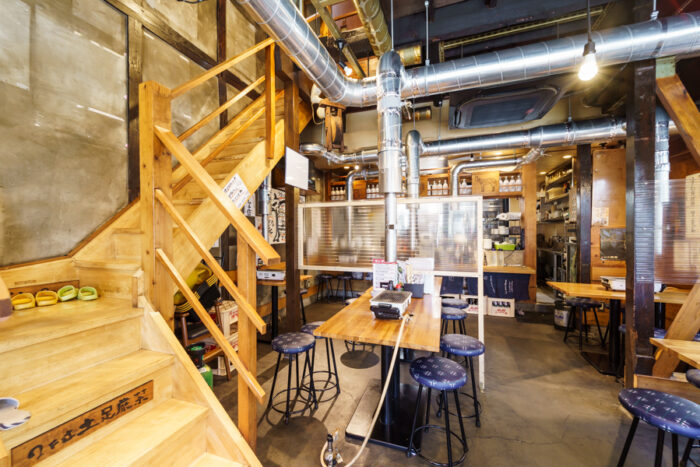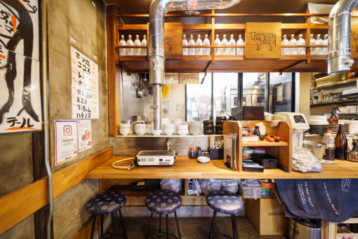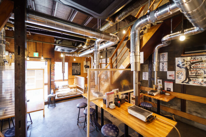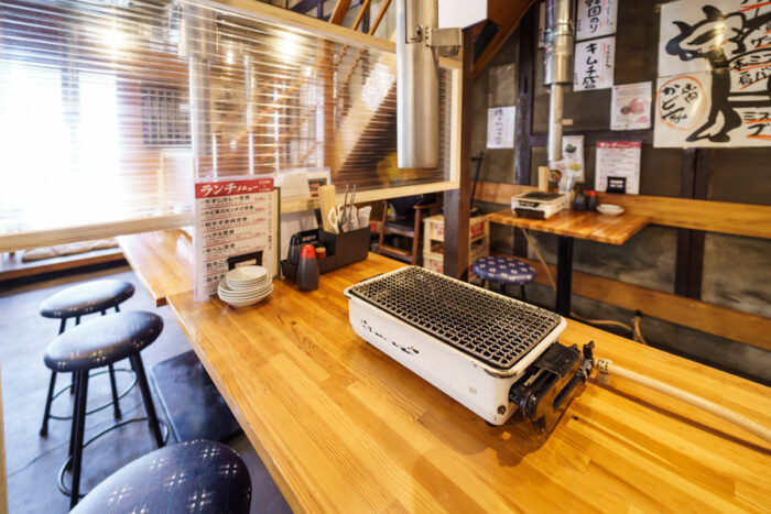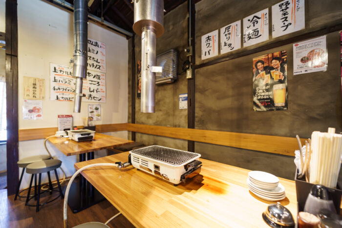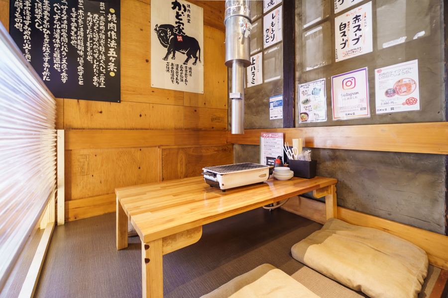 “かど家”という屋号の由来は、この鶴ヶ丘店が大通りの角地にあったから。多くの看板が目を引く現代的な外装とは一転して、古民家風の店内が古き良き焼肉店を感じさせます。席ごとではなく、大型のダクトで換気を行っているので、店内に一歩入ったときからお肉のおいしい香りが食欲をそそります。お荷物への匂い移りがないよう、カバーを席ごとに配置するなどの対策をしておりますので、お気兼ねなくご利用下さい。