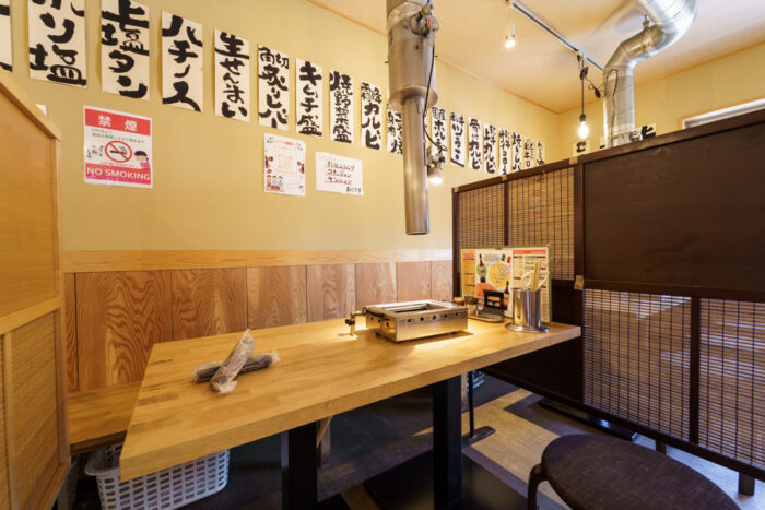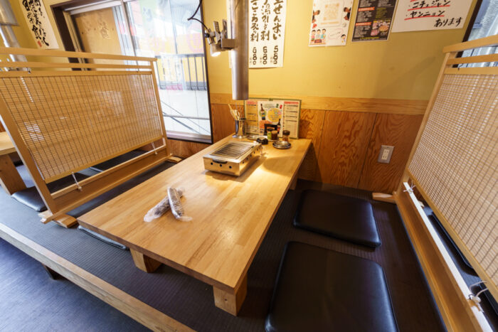 シンプルで清潔感のある木目調の4名様用テーブル席が2卓ございます。ゆっくりお肉を焼きながら、お寛ぎください。お仕事仲間や仲良しグループはもちろん、ご家族でのアットホームな焼肉会をどうぞ。